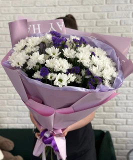 Пышный букет из нежных кустовых хризантем, созданный для того, чтобы приносить радость. Изысканная упаковка, олицетворяющая элегантность, придает этому букету неповторимый вид. Равномерное сочетание ярких оттенков и нежных тонов создает впечатляющий визуальный эффект и наполняет пространство пышным цветочным ароматом. Этот букет - идеальный подарок для любого повода, который поднимет настроение и подарит незабываемые эмоции.